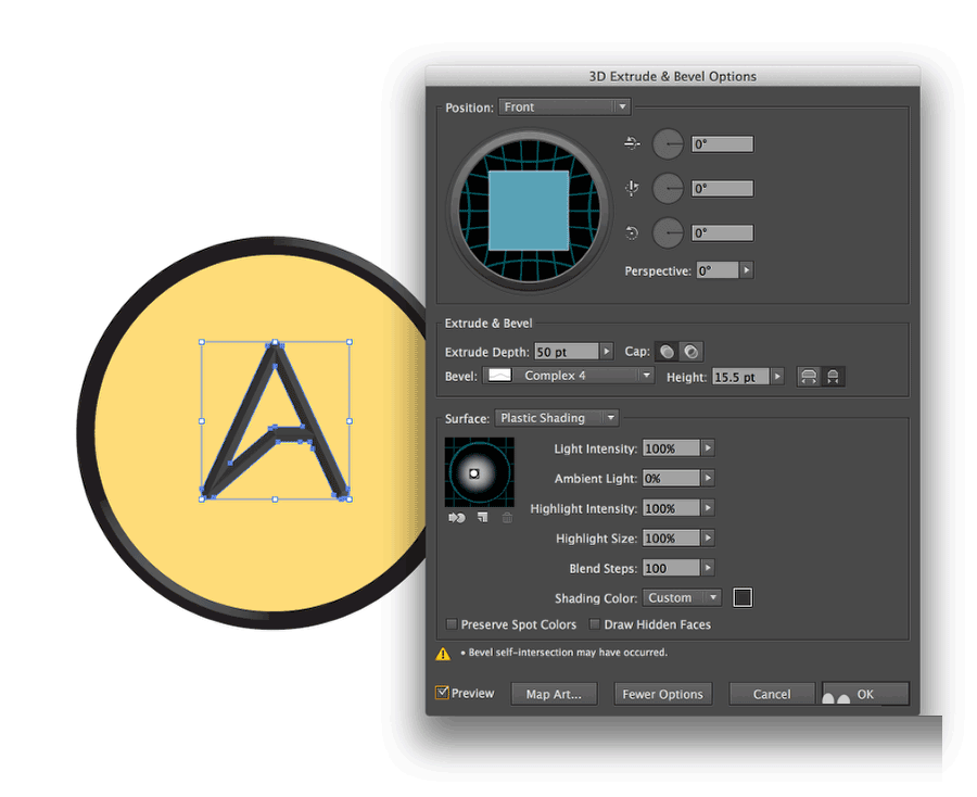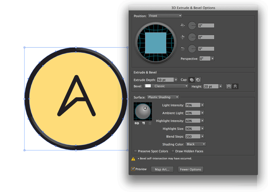 2、选择黑色的外圆,然后选择效果>3D>突出和斜角。位置设置成“前方”,突出和斜角设置成“50”pt,高度设置成“20”pt,斜角类型设置成经典。还选择内斜角选项,如下图所示设置灯光参数。