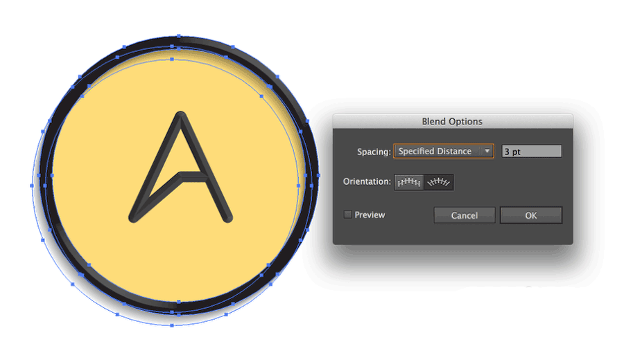 4、我们将使用混合工具(快捷键W)创建阴影。接下来,复制这个标志并粘贴在同样的位置。然后,复制这个标志并向下移动,再向左移。改变这个标志的不透明度,一个改成50%,另一个改成0%。透明模式也使用正片叠底。用混合工具点击所有的标志以创建混合。将特定距离改成4px。