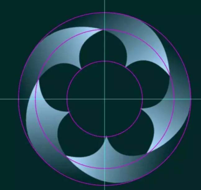 接着选择绘制好的图形,同样的方法使用“旋转工具”复制出其他几个图形,如下图所示。紧接着观察发现此时的每两个图形之间的交集出会多出一部分,继续进行调解,选择任意两个图形,将其改变为红色,如下图所示。最后,执行“路径查找器”中的“分割”命令,对其进行分割,分割完成后其余部分删除,留下我们需要的一个图形,如下图所示。