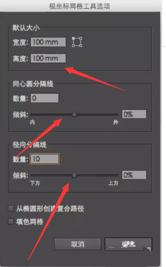 3、我们需要选择“极坐标网格工具”,在画布空白处点击鼠标左键,在弹出的“极坐标网格工具选项”窗口中设置“宽度/高度”均为100mm、“同心圆分隔线”的“数量”为0、“径向分隔线”的“数量”为10,单击“确定”,创建一个极坐标网格,如下图所示。