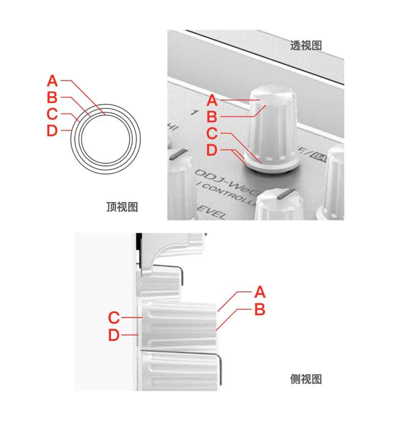 在侧视图上测量旋钮结构线ABCD相对于基准面的垂直距离。本案例中的侧视图上没有显示出旋钮与基准面的间隙,可以自己设定适当的距离。