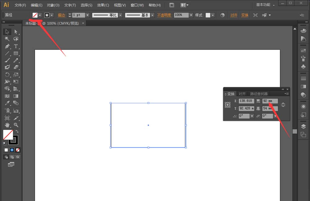 3、再次画一个矩形。将前景色取消,点击箭头红线上方选择斜杠即可取消。将矩形的中心点和第一个矩形对齐,调整宽90高54。然后再箭头所指处宽地方输入“90+2“。这是名片的出血部分。