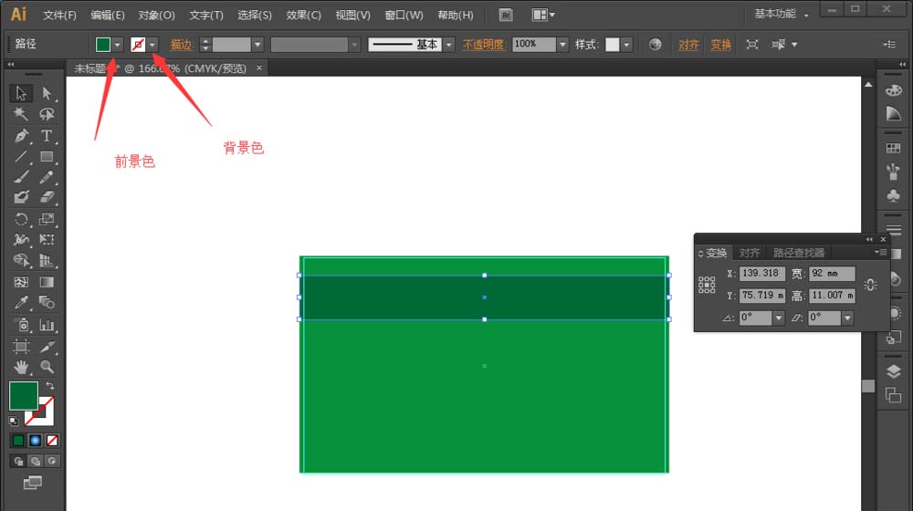 5、点击大的矩形,填充颜色。在前景色选择自己喜欢的颜色即可,将背景色取消,选择斜杠。再次画一个矩形,填充一个其他颜色,拖动到大举行内,宽调为92,与大矩形对齐。