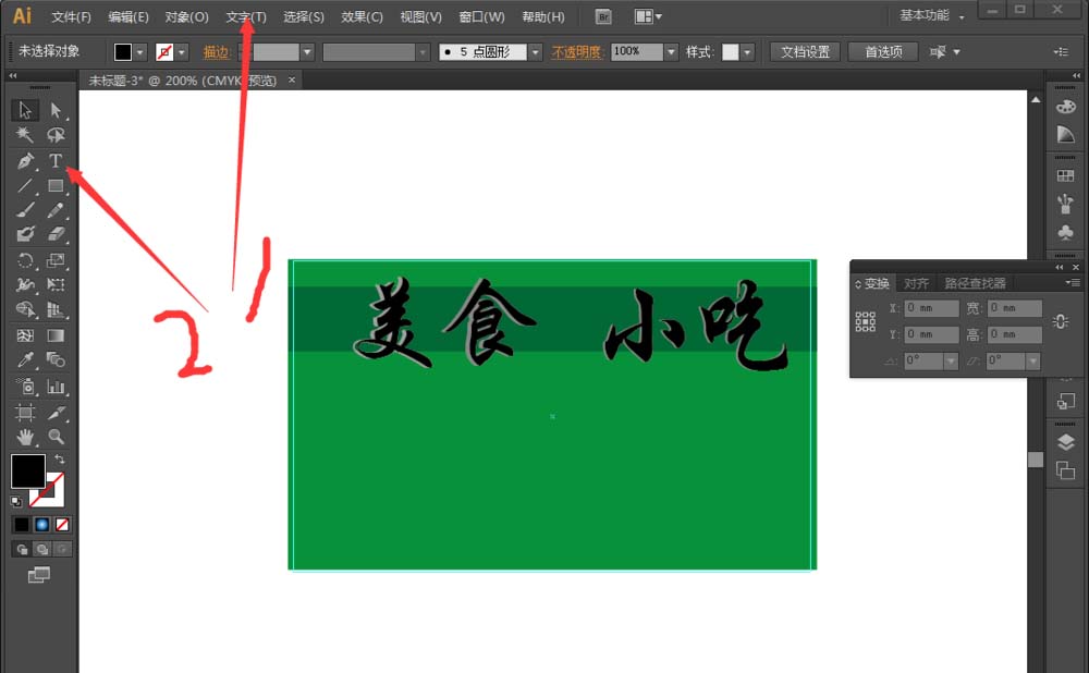 6、点击箭头1,设置文字的字体以及大小。然后选择箭头2,使用文字工具输入字体。小编先输入美食二字,然后在输入一个美食。将第一个美食改编成灰色——右键——排列——后移一层。然后用键盘←键移动,制造出立体的视觉。用同样的方法制作小吃二字。