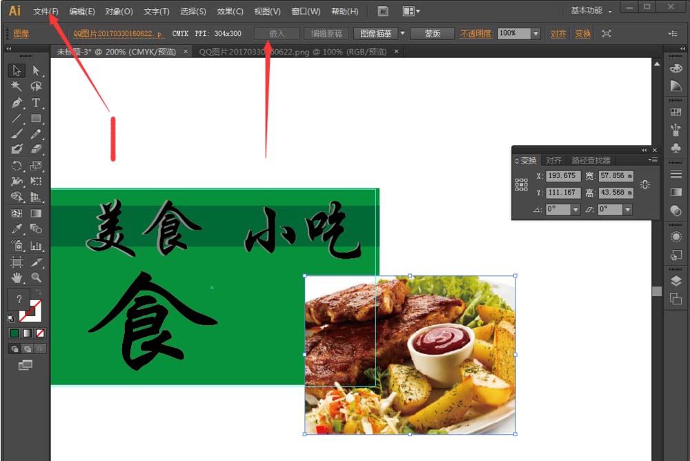 7、再输入较大的主题字,小编的是一个”食“字。然后找一张图片,点击箭头1所指的文件,选择置入。然后在箭头2所指的地方,点击嵌入。
