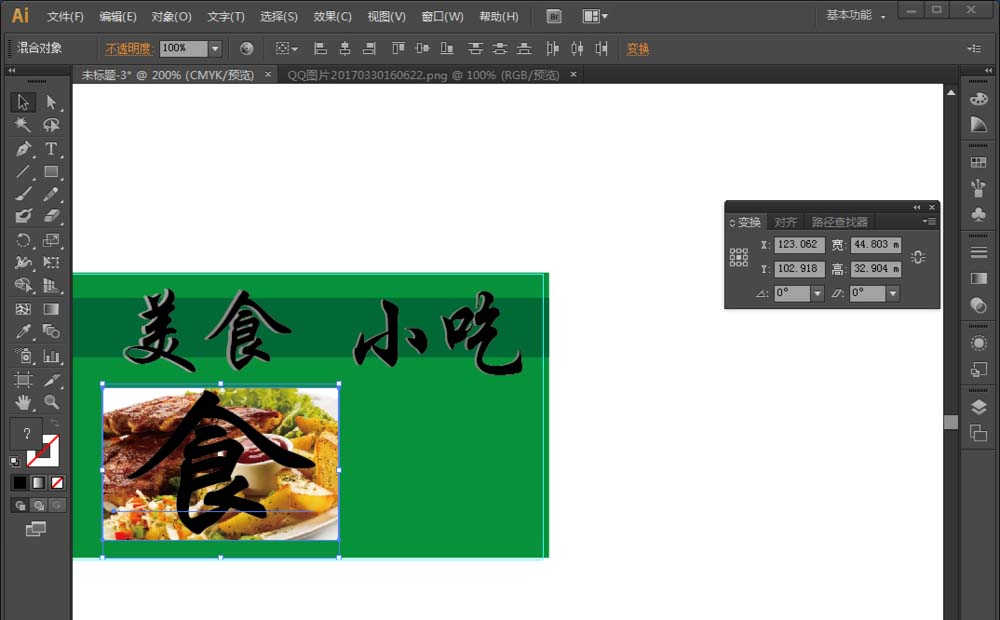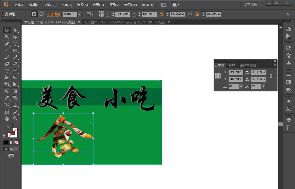 8、将图片调整到主题字大小,移动到主题字上方。会出现把字体遮住的情况,右键——排列——后移一层。点击下图片然后按住shfit键点击主题字——右键——创建剪贴蒙版。如图二样式。