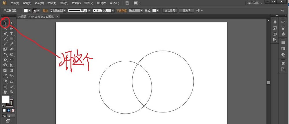 3、选中两个圆,准备调出重合区域--首先点击AI界面左上方的那个空心黑色箭头,如图中所圈所示,然后按住shift键,同时依次点击两个圆,待俩元颜色加重后就表示选中了,这时候松开手。选中后的图形如图。