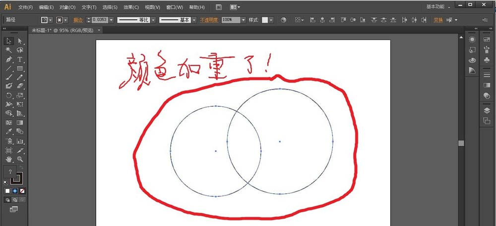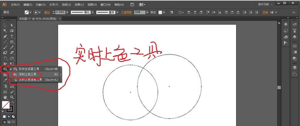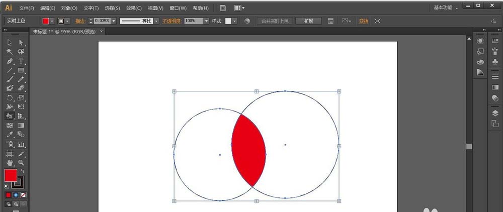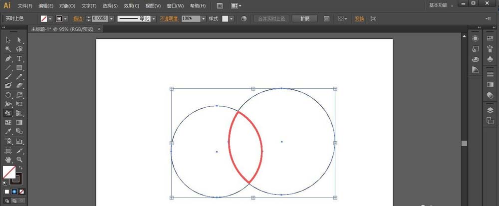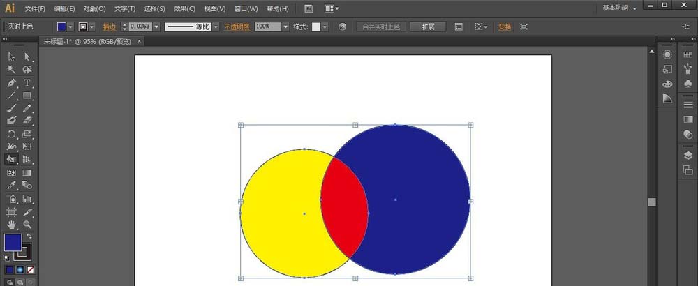AI中给几个简单图形重合区域填充颜色,有一种很简单的方法,今天介绍给大家。我以两个圆的重合区域上色为例子。再在不重合的区域分别上不同颜色。