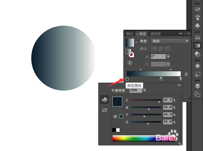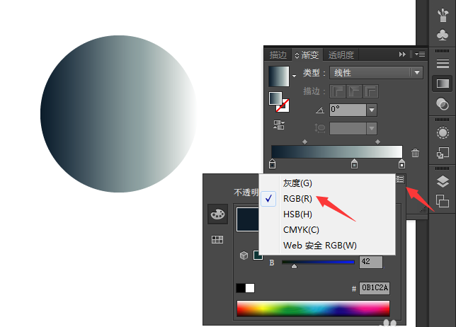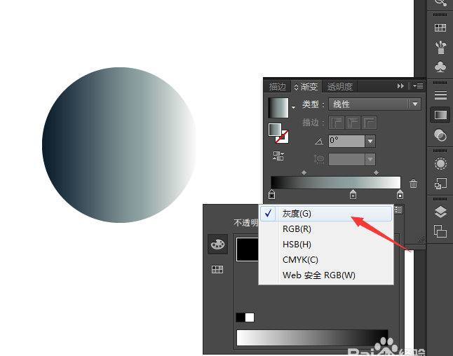 3、图三:双击色标,就会出现一个二级面板,图四:二级面板右上角还有个选项,点击RGB就能改变颜色了,图五:再选灰度,能改变颜色的明暗。其他选项根据自己的需求摸索一下。图六:最后还能改变透明度。