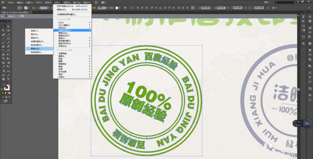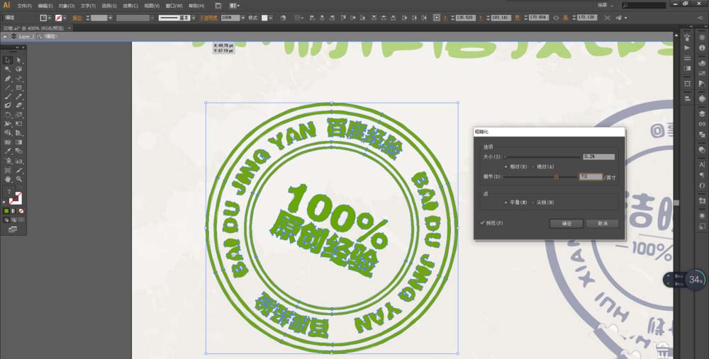 6、磨损效果制作:选中图章,单击效果→扭曲→粗糙化。根据图形具体调节大小和细节,勾选平滑