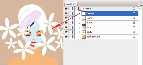 将一层之上,选择层,并将其拖动到顶部。 现在,花是顶部层和覆盖整个画面