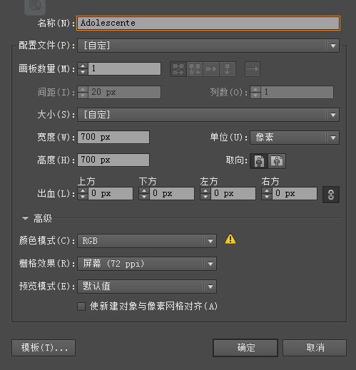 新建文档(Ctrl+N),大小随意,这里是700*700px,RGB,分辨率72,新建对象与像素网格对齐不勾选。