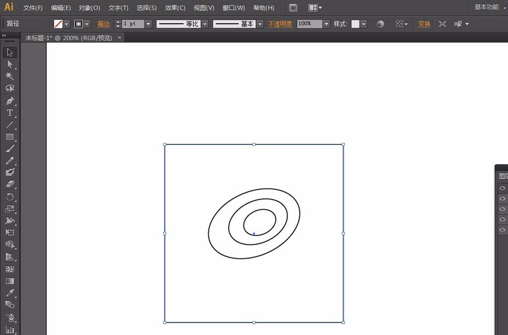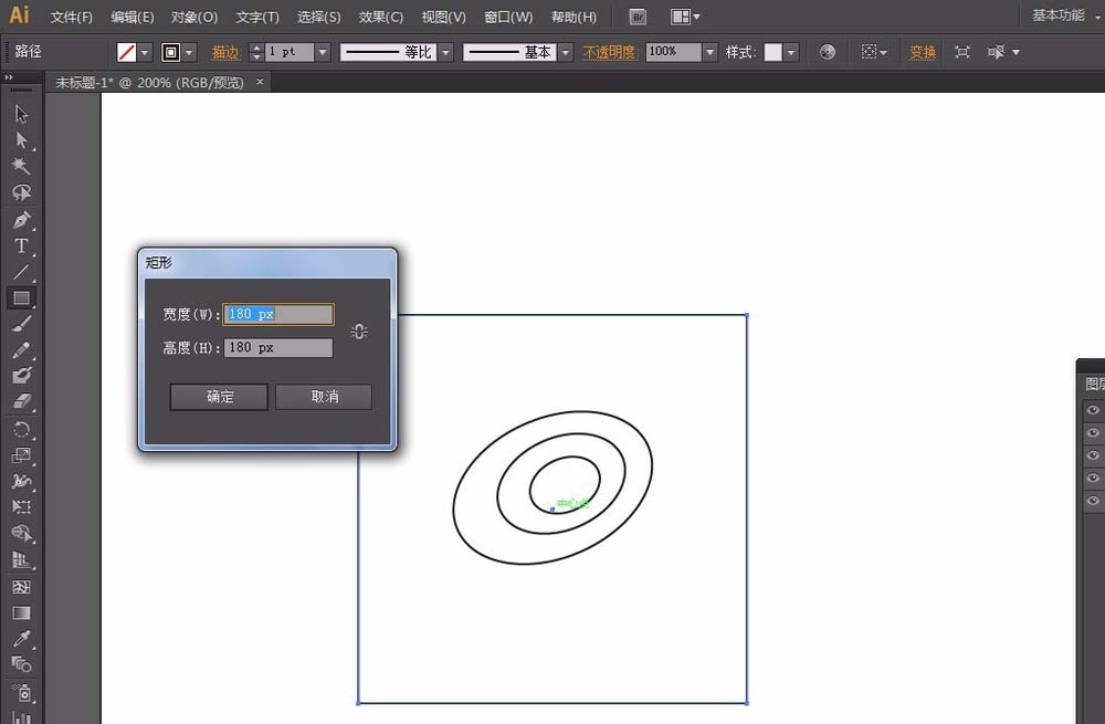1、使用矩形工具在画板上点一下,然后宽高输入相同的值绘制一个矩形。然后在矩形范围内绘制一个如图的形状,可用椭圆工具绘制。