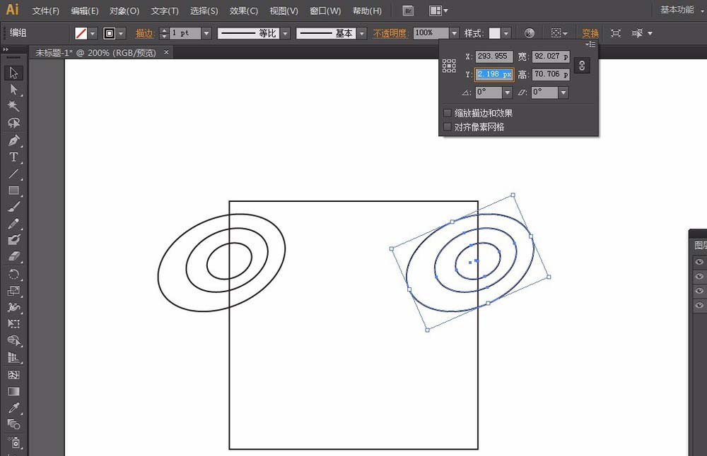 3、将椭圆形状移到方形的左上角,在选中状态下,按CTRL+C复制,按CTRL+F粘贴在前面,然后点击工具栏上的【变换】,在X后面+180pt回车,此时可以看到复制的椭圆形状被移动到了方形的右上角。