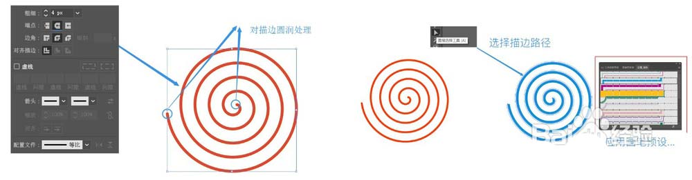 4、用“选择工具(V)”点击剩下的描边路径并进行描边的圆润处理,即可得到简单的等距螺旋线。亦可进一步应用画笔预设让螺旋线更有特点。