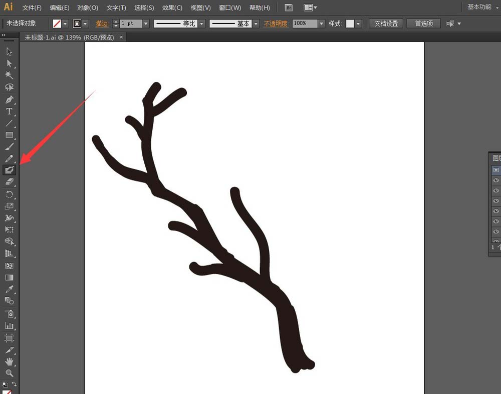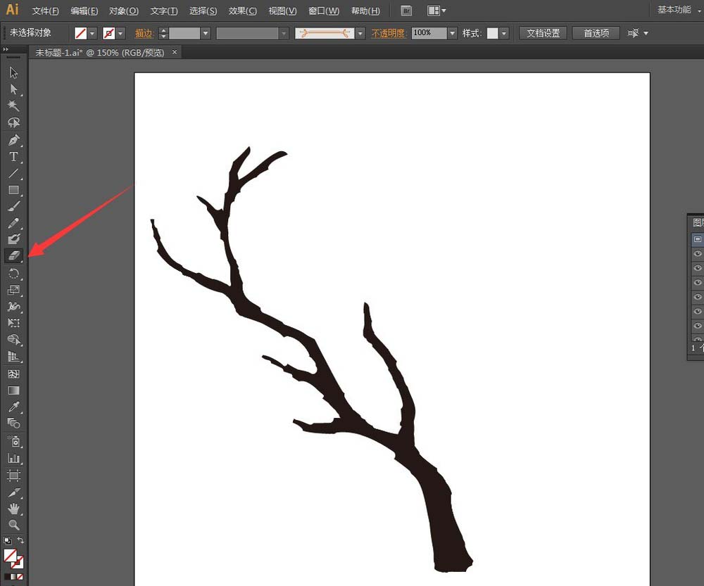4、使用【橡皮擦工具】在树枝的边缘抹除,以画出树枝分杈的形状。画的时候如果有需要可以将橡皮擦工具里的画笔大小改小一点抹除,如果抹除太多的话,还可以使用【斑点画笔工具】继续补足缺失的部分。