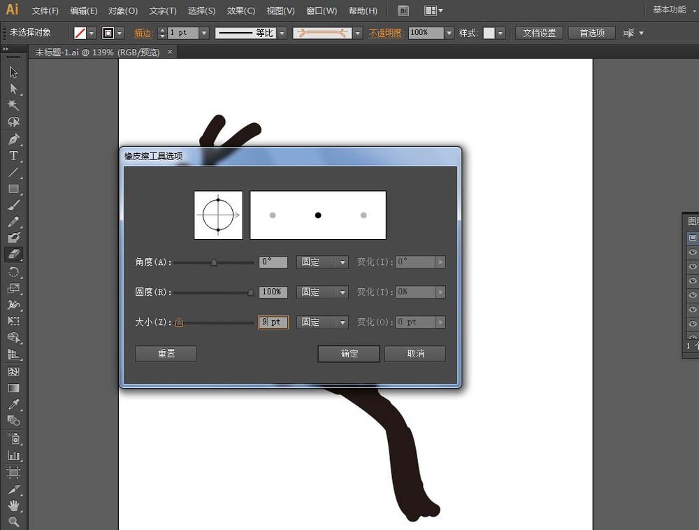 3、双击【橡皮擦工具】,弹出【橡皮擦工具选项】窗口:画笔大小:9pt,固定,确定