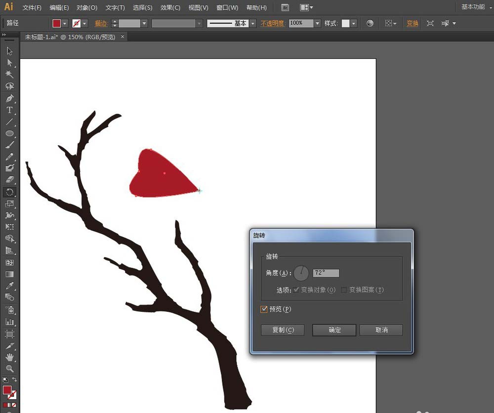7、选择【旋转工具】,在花瓣中心按住ALT键点击,弹出【旋转】窗口:勾选【预览】,输入旋转角度:72度,点击【复制】,然后不断地按CTRL+D执行复制命令