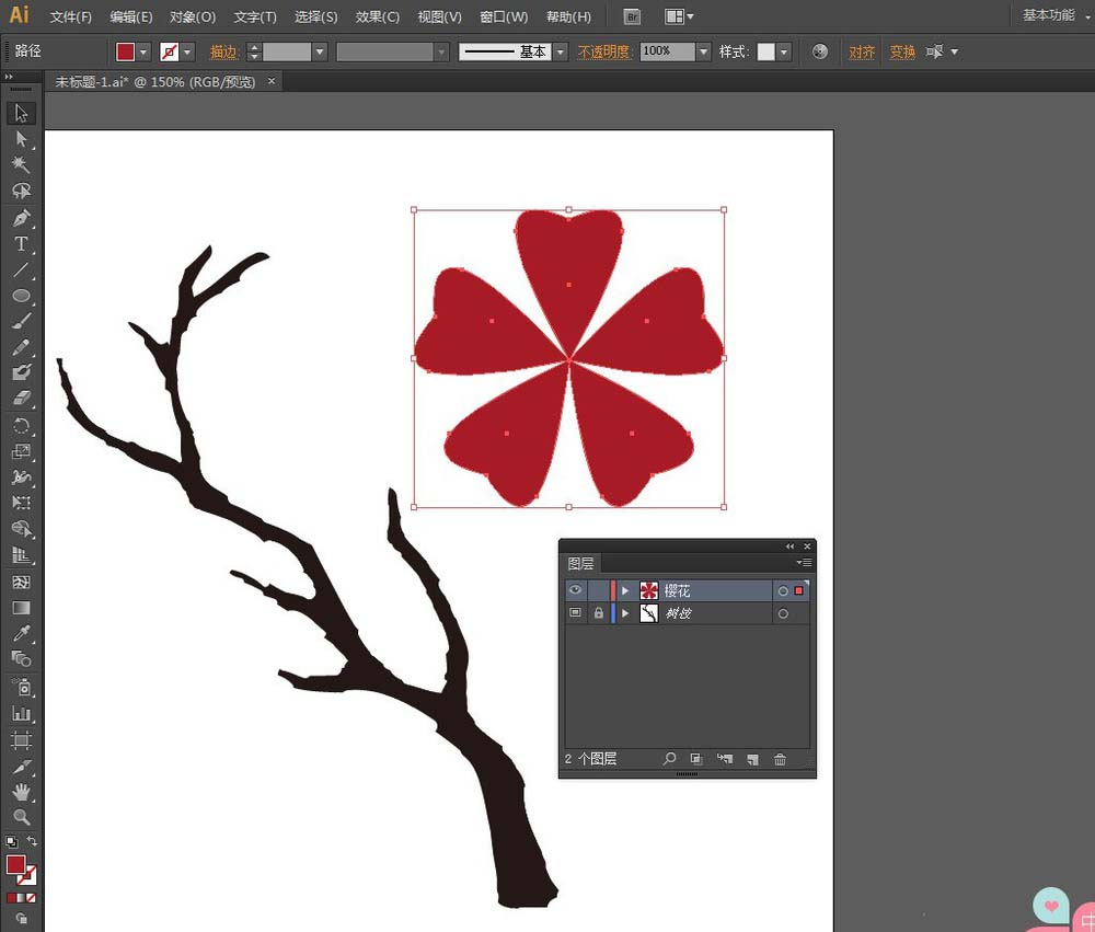 12、解锁【樱花】图层,然后在新的树杈上缀上一些樱花花瓣,如果需要的话,可以再次锁定【樱花】图层,调整一下树杈的细节部分。