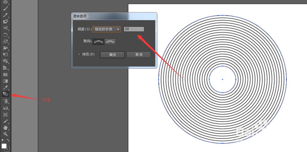 2、然后选择混合工具,先点一个大圆圈,再点小圆圈,就会出现多个圆圈的效果了。(其实随意点哪个圆圈先都可以)