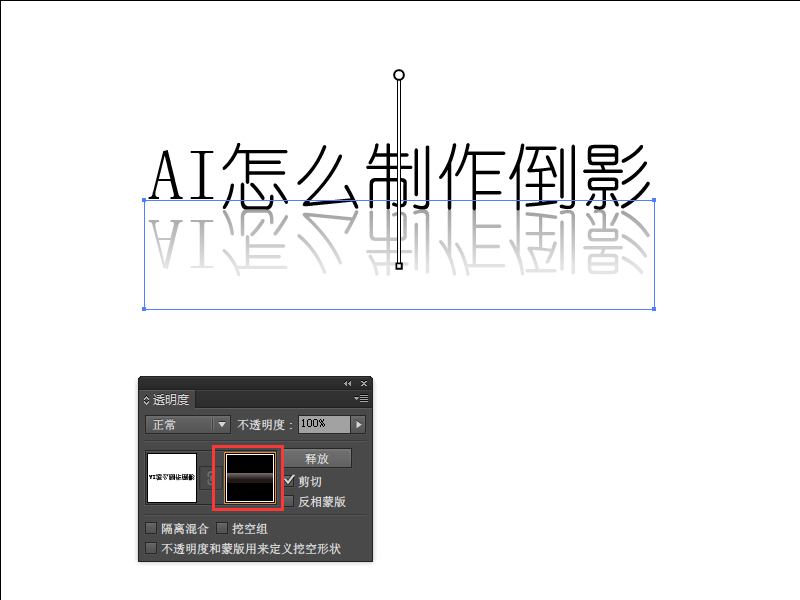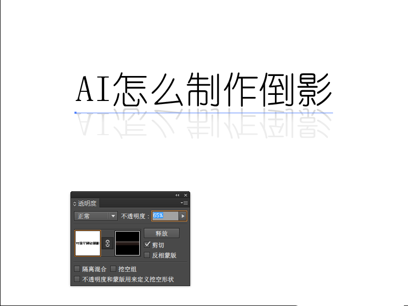 4、将变换好的“倒影”和上面的文字贴紧,shift+ctrl+F10调出透明度的控制面板。点击右边的小三角 选择“建立不透明蒙版”