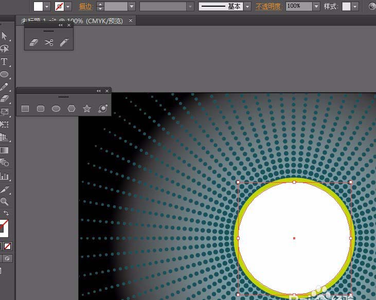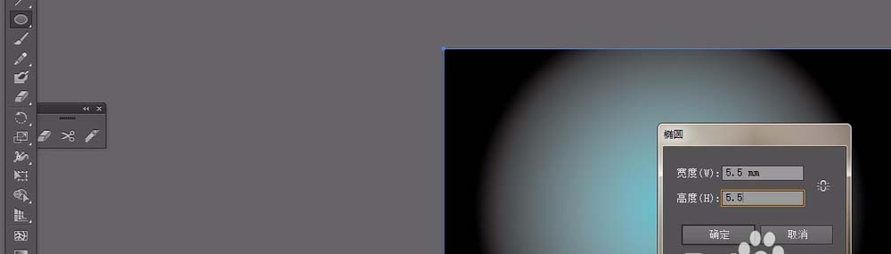 3、绘制一个椭圆大小为5.5x5.5的。选择椭圆工具,在页面上单击一下。颜色填充为cmyk:60;0;20;73;去掉轮廓按/;按住shift和alt键。复制一个。如图。
