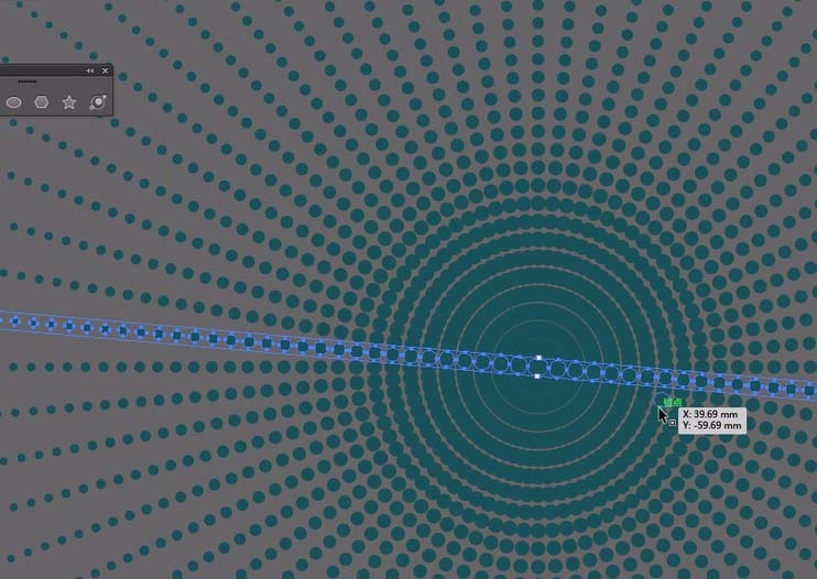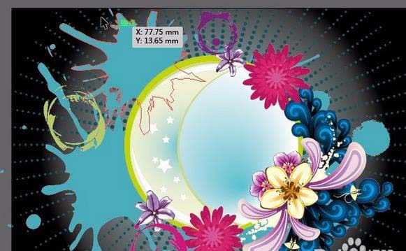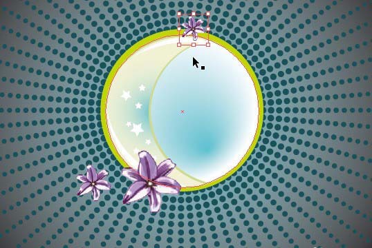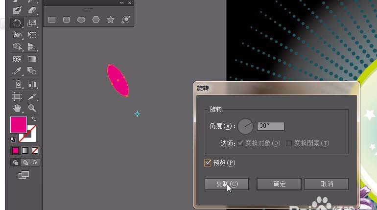 15、用椭圆工具绘制小椭圆。然后选择旋转工具按住alt在页面点击,然后按ctrl+d再制。如图。在中间绘制一个圆。全选。然后联集。如图。ctrl+C;ctrl+f;复制一层,缩小,换颜色。再复制,再缩小。在填充不同颜色。然后群组。放在合适的位置。