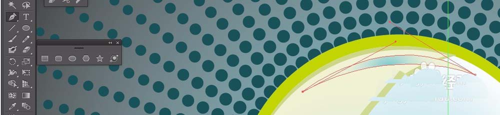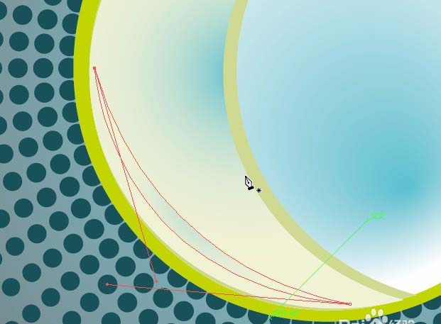 8、锁住背景图层,然后新建一图层。如图。按住shift键,绘制一个圆形。颜色填充为cmyk:31;0;100;0;ctrl+C;ctrl+f;复制一层粘贴在前面。按住shift+alt键,缩小一些。然后填充成白色。按住shift键,让上面两个角都缩小一点。如图。然后填充渐变色。
