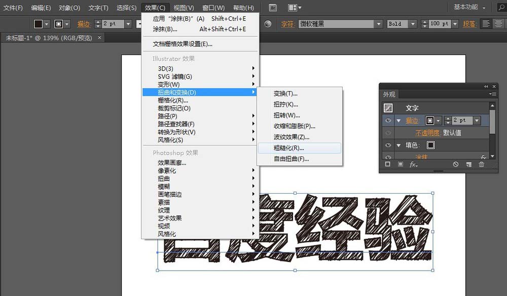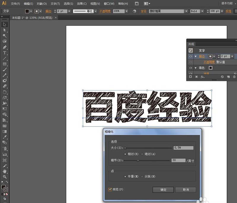 6、在【外观】面板描边选项选中状态下,执行【效果】菜单——扭曲和变换——粗糙化。弹出【粗糙化】窗口:勾选【预览】,大小:0.5,选择【相对】。细节:30,点:平滑,确定