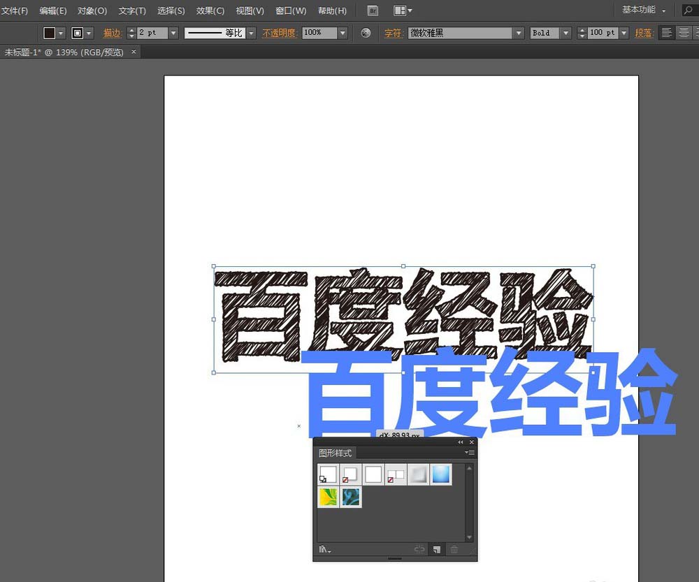 7、以后想要应用这种字体效果的话,可以把这个应用拖拽到【图形样式】里:选中【百度经验】,将它拖拽到【图形样式】面板的【新建按钮】图标上。以后输入文字可以直接应用保存创建的这个图形样式。