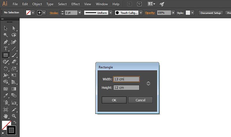 第2步、选择矩形工具,然后在空画布上单击一次。将弹出一个对话框,询问要制作的矩形的尺寸。将其设置为13厘米x 12厘米。单击确定按钮确认矩形的尺寸。