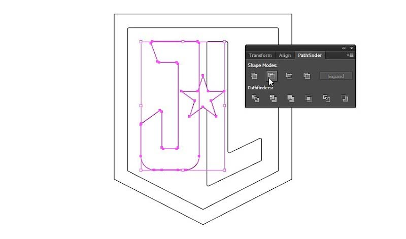 第21步、粘贴(Control –F)我们之前在同一个地方复制的星形。选择星形和剩余的字母,然后从路径查找器面板中减去它。