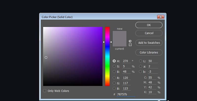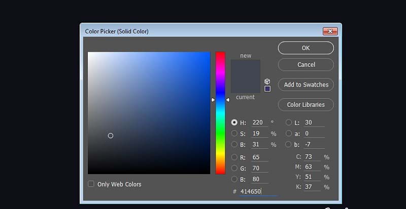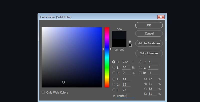 第3步、单击图层面板底部的创建新的填充或调整图层图标来添加纯色。在接下来的对话框中,选择一个深色(#0e0f16)作为画布背景色。