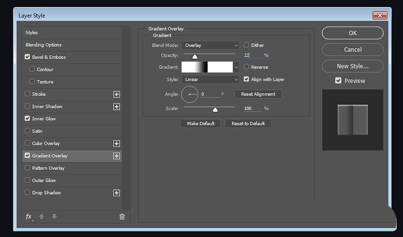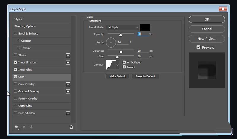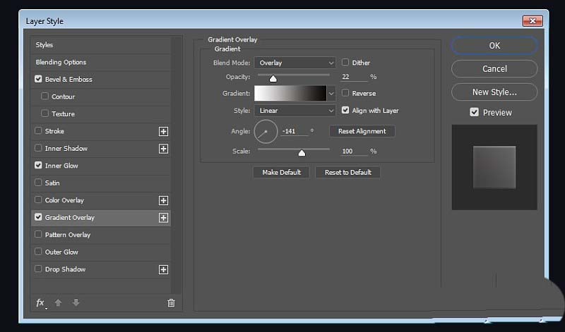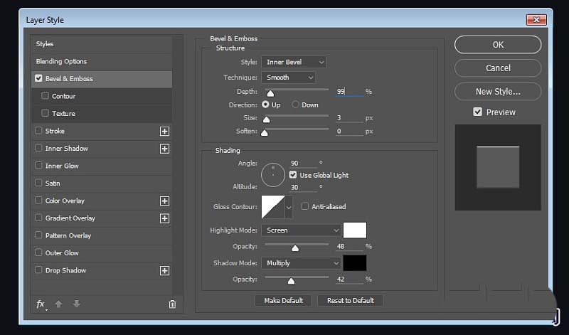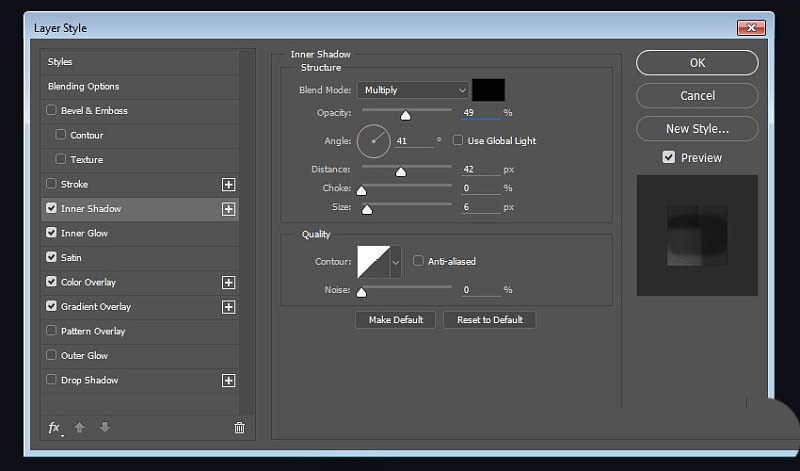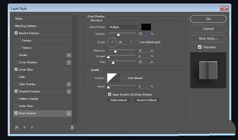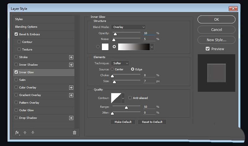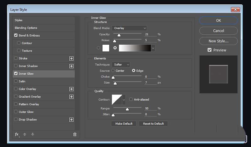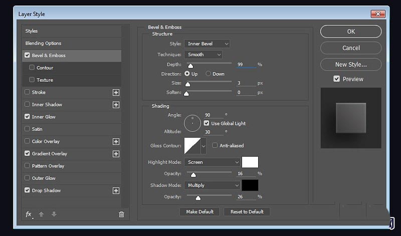 第9步、确保选择字母形状的图层,然后双击图层以添加一些样式。我们要添加斜面和浮雕,为字母表面添加一点3D效果。内发光和渐变叠加会让它的表面有光亮。而投影会将字母从背景中提起来。