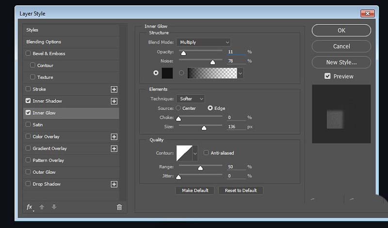 第10步、我们还需要在外框层上添加样式。对于外框,添加一个大的内发光与强烈的白色到黑色渐变来显示表面的金属光亮。