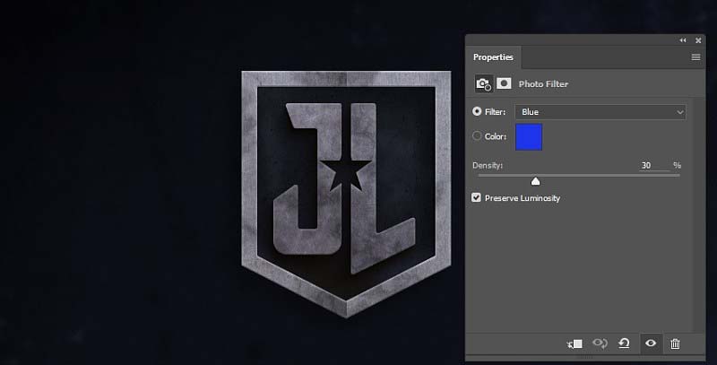 第14步、我们想在背景中添加一个蓝色的阴影。从图层面板中,添加一个照片滤镜,并选择 蓝色。默认情况下, 照片滤镜调整图层影响它下面的每一个像素。为了限制它只影响背景,给它添加一个图层蒙版并用黑色画笔擦出LOGO。