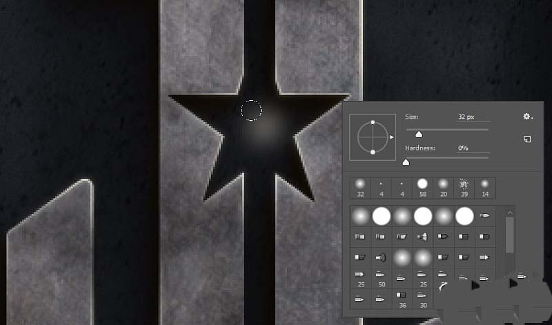 第5步、放大字母的中心,就在空的星形区域。使用柔边圆画笔,用淡黄色在新图层上轻点一次。
