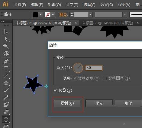 3、点击旋转工具,按“ALT”键,在五角星的任意一个角左击!然后就弹出一个窗口,可以填写合适的角度,或者需求的角度!