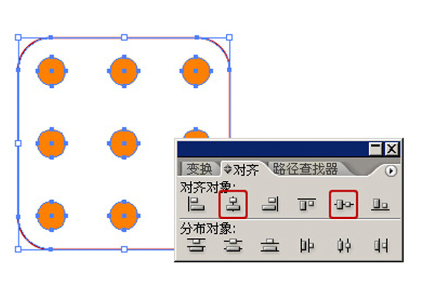 使用选择工具选中所有图形,在对齐调板中在对齐调板中单击“水平居中对齐”和“垂直居中对齐”按钮各一次。