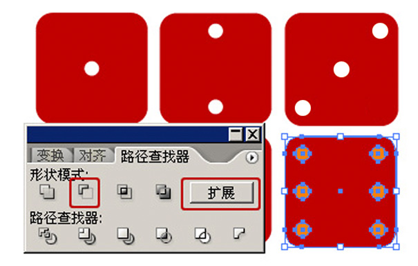 使用选择工具如下图所示选中一个图形,在路径查找器调板中单击“与形状区域相减”按钮,并单击“扩展”按钮,将圆点挖空,并依次将其他5个图形分别挖空