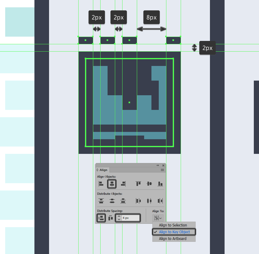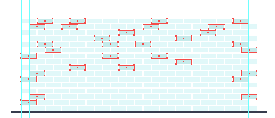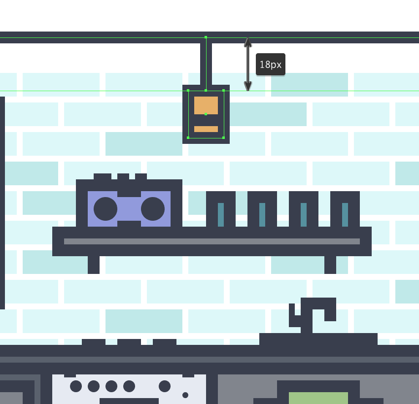 画瓷钻:画十四个26 x 8 px矩形(#DEF8F9)创建第一行瓷砖。将14个矩形彼此水平分布 相距2px,然后进行编组(Control-G),最后将它们放置在离地板左边缘32px的位置。