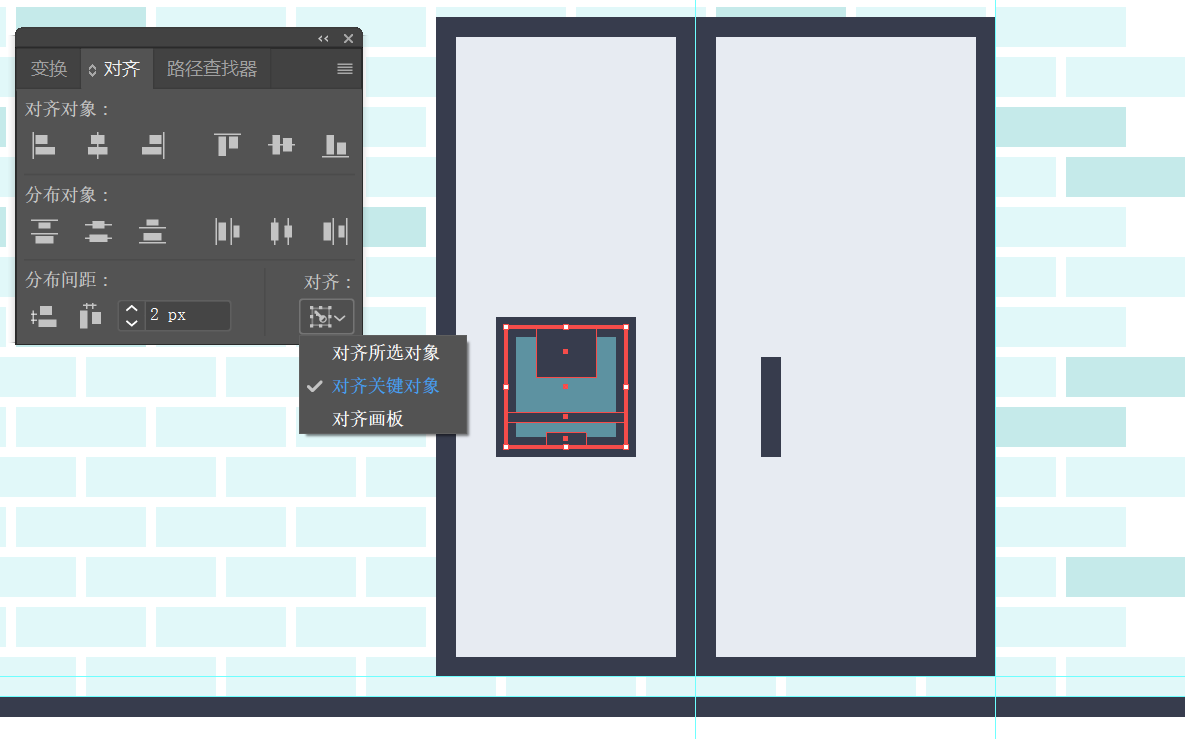 1.创建饮水机分配器,24×24px的正方形(#5592A0)以及它的轮廓描边4 PX (#363C4C),编组后与左门中心对齐,放置在距离左门底边缘40px处。