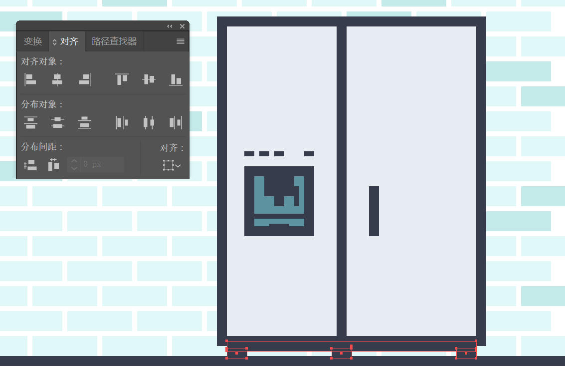 绘制冰箱的底座:在编好组的冰箱下面绘制一个100 x 4 px的矩形(#363C4C)作为底座,同时绘制三个8 x 4 px矩形(#363C4C)放在底座下面作为冰箱的脚。在之后进行编组,我们就完成了一个冰箱的绘制。