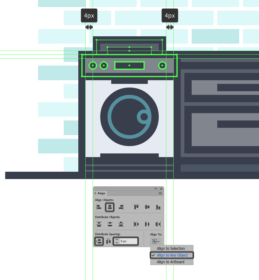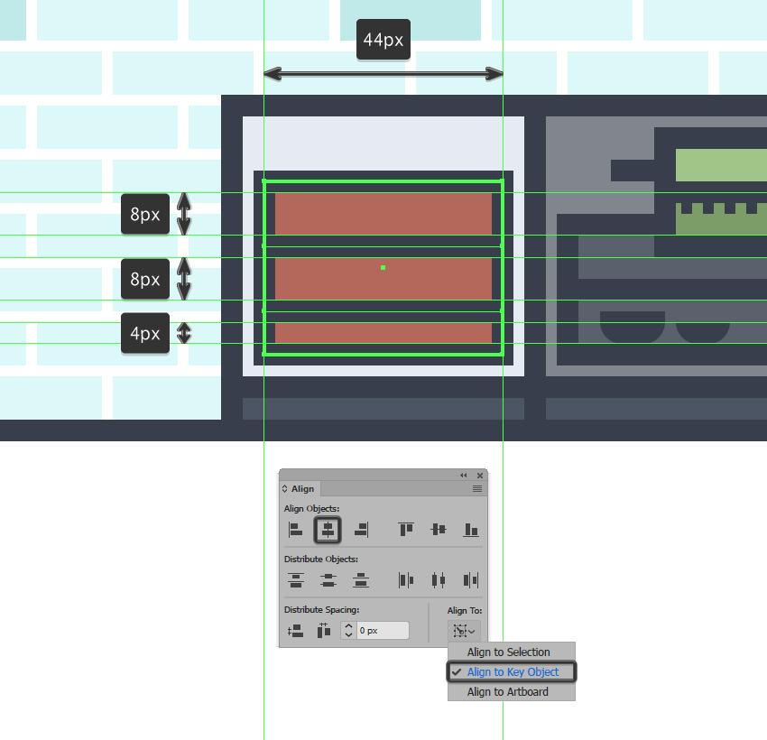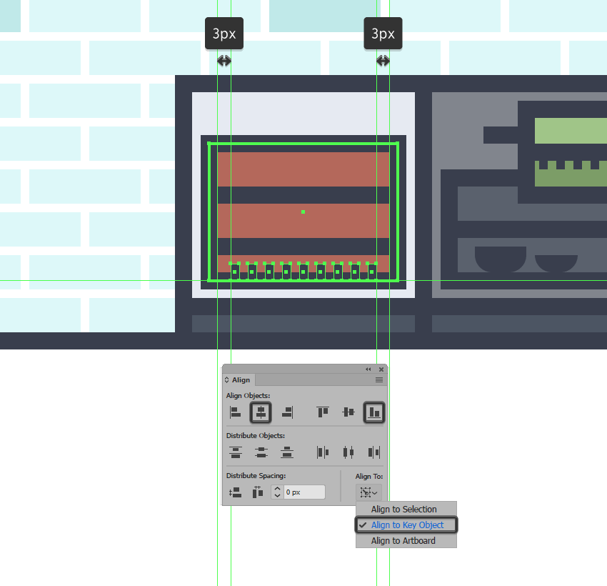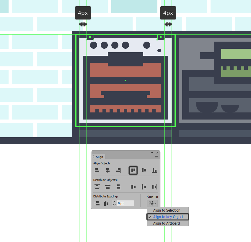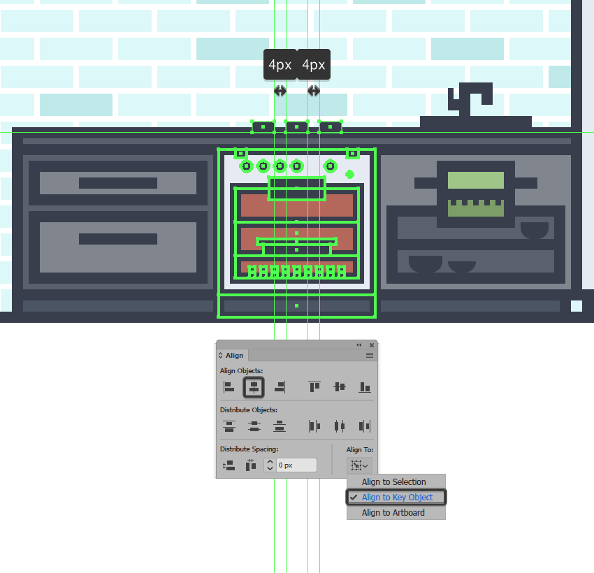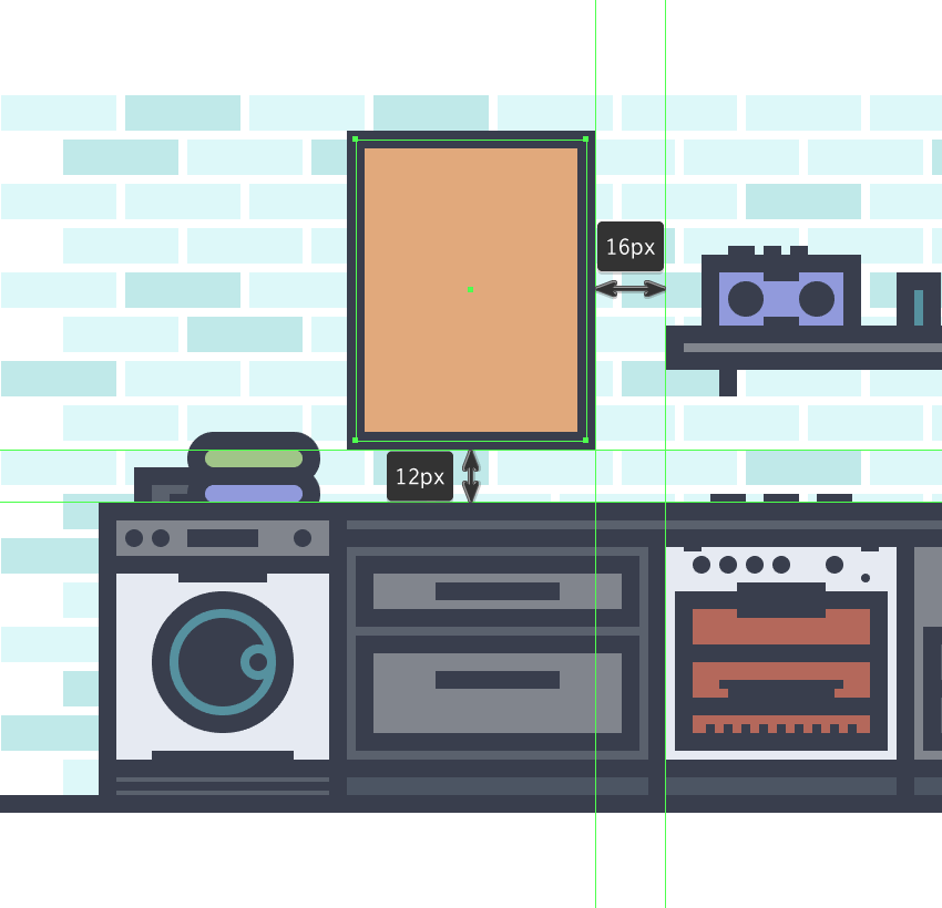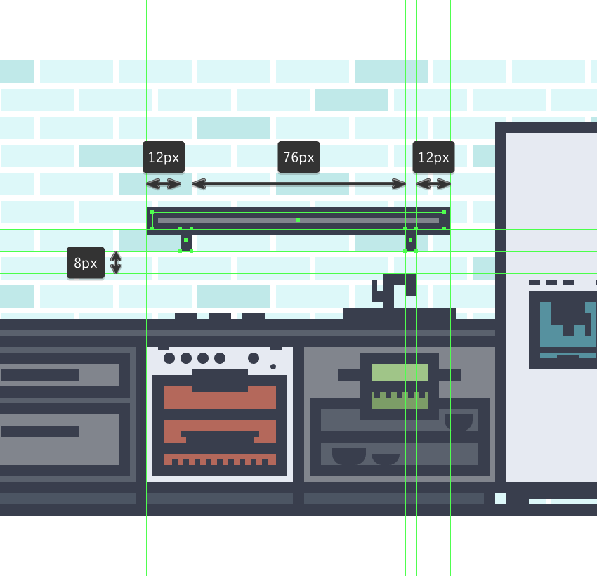 绘制三个8 x 4 px矩形(#363C4C),其水平间距4px.编组后,将其与烤箱中心对对齐。最后将整个厨房灶台编组后进入下一个部分。