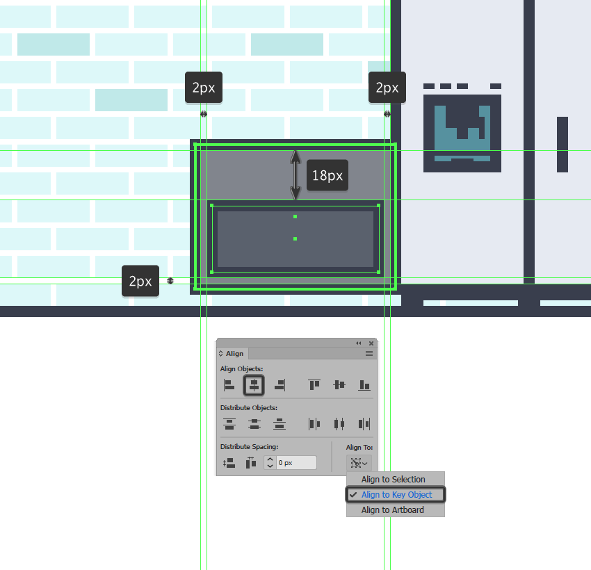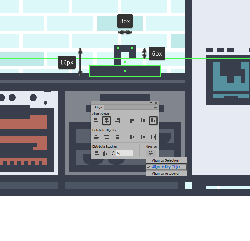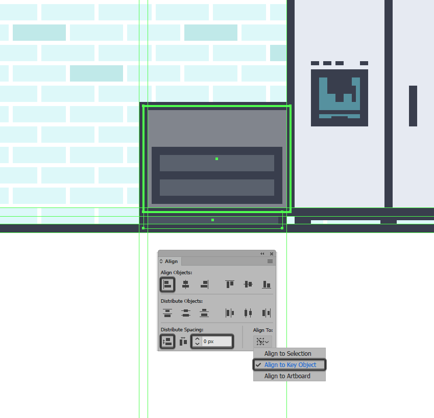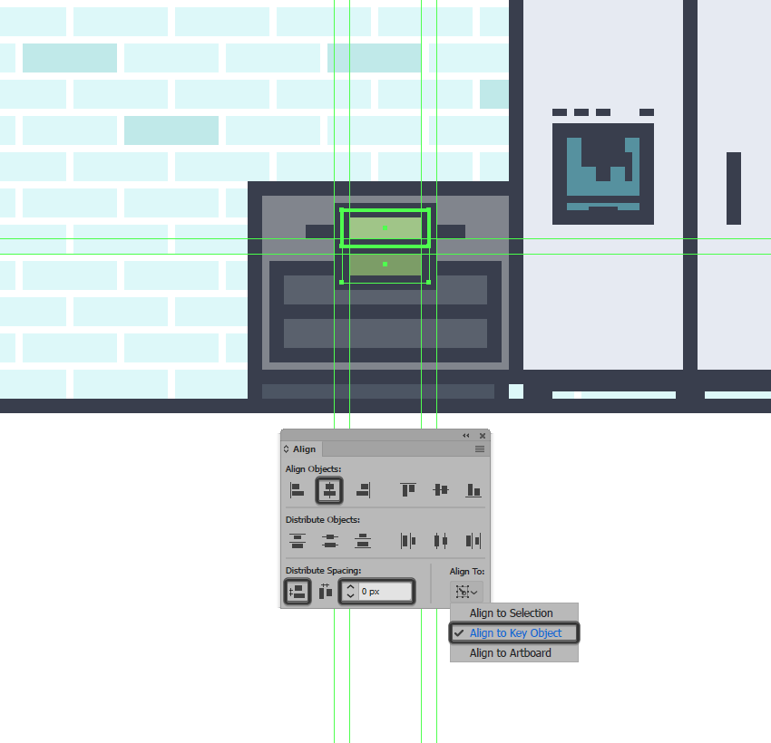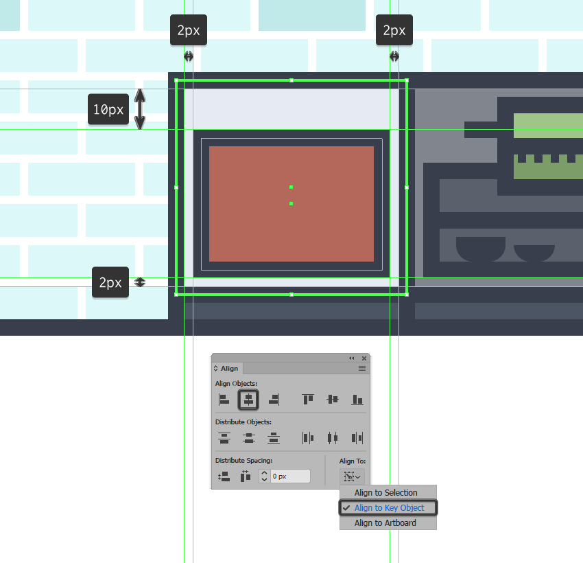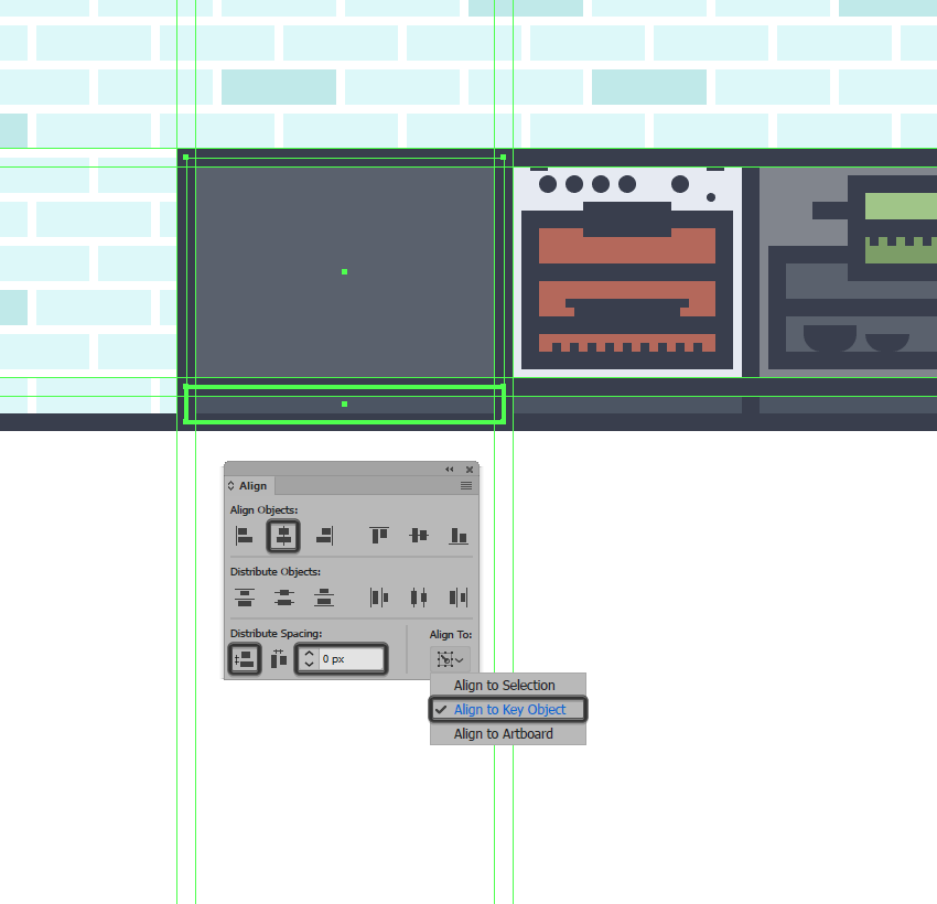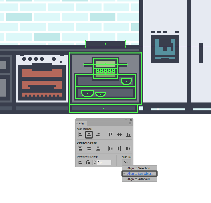 绘制三个8 x 4 px矩形(#363C4C),其水平间距4px.编组后,将其与烤箱中心对对齐。最后将整个厨房灶台编组后进入下一个部分。