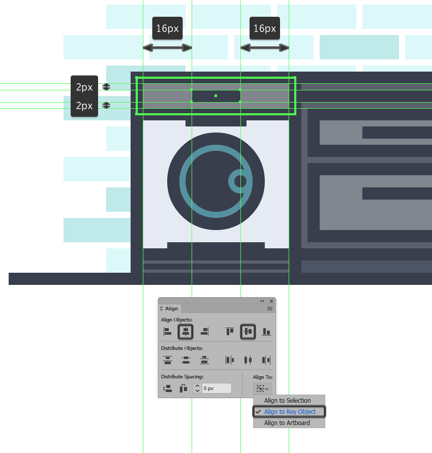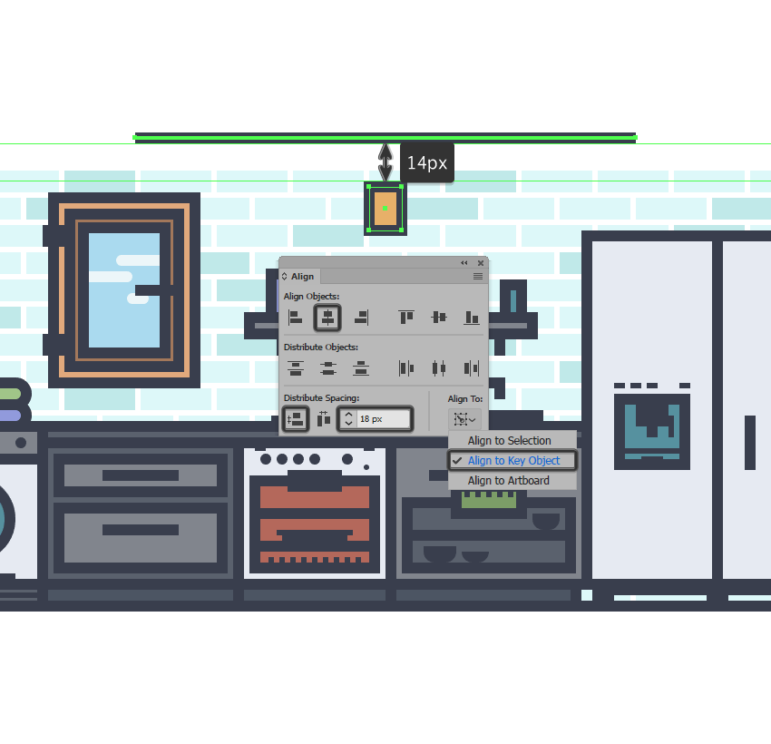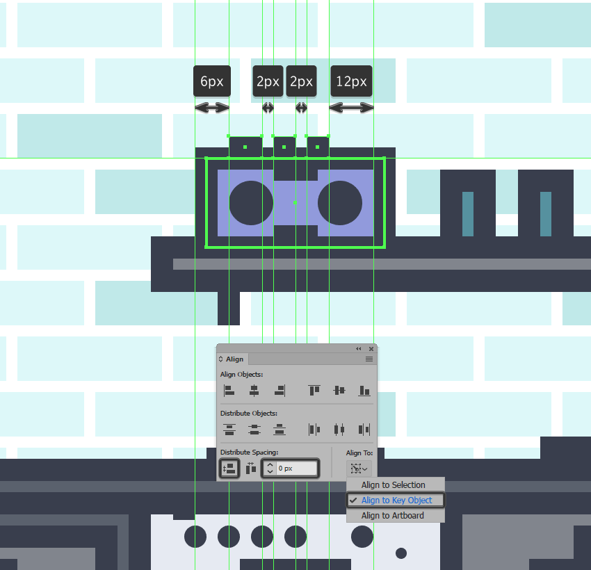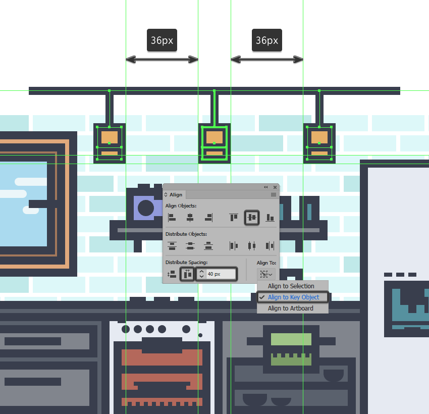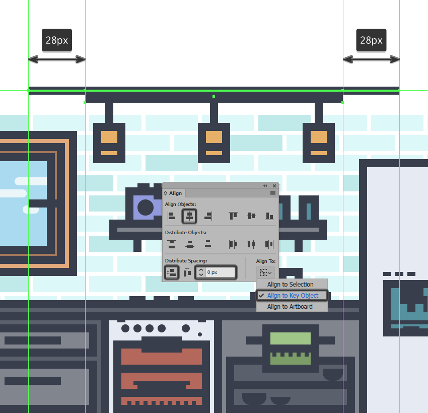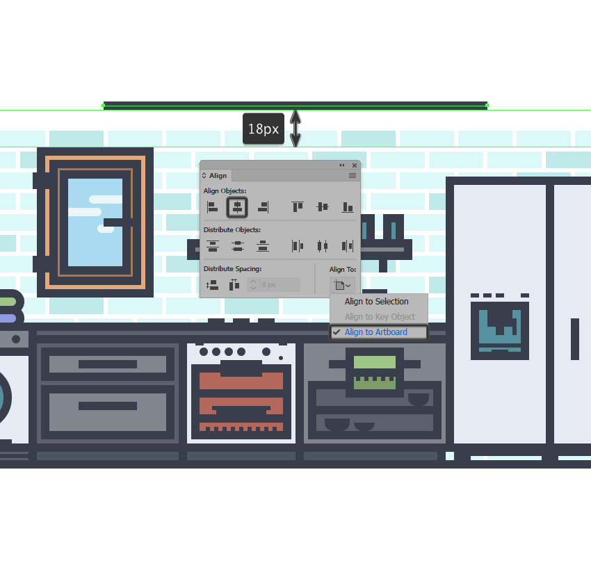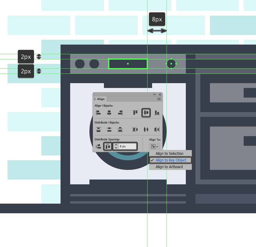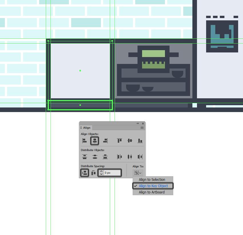 绘制三个8 x 4 px矩形(#363C4C),其水平间距4px.编组后,将其与烤箱中心对对齐。最后将整个厨房灶台编组后进入下一个部分。