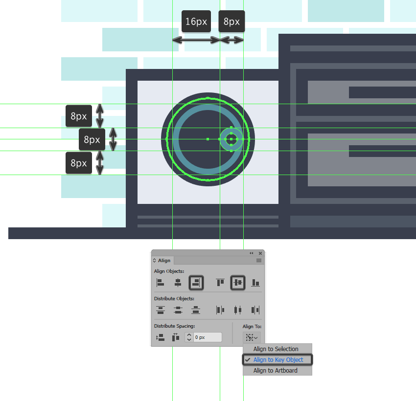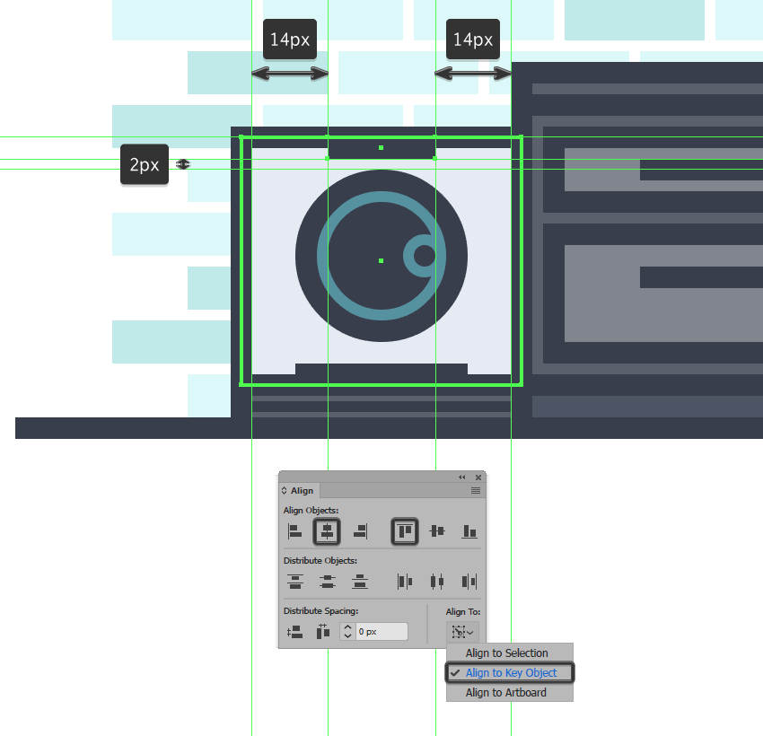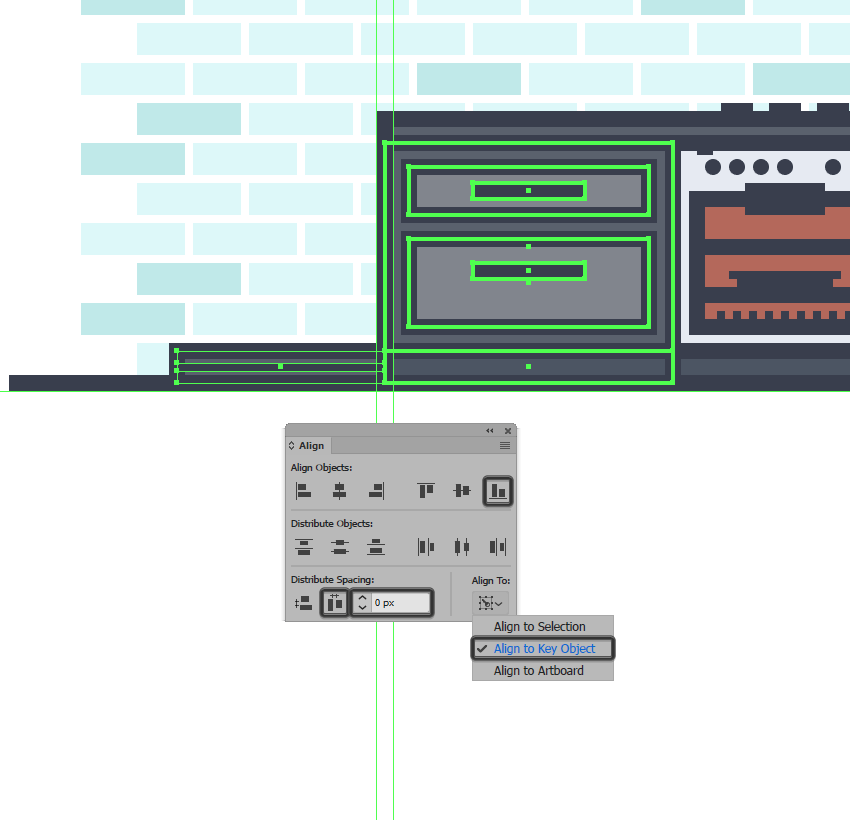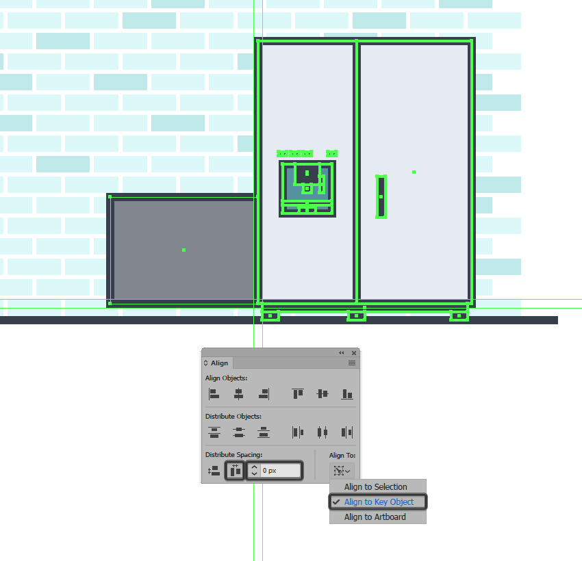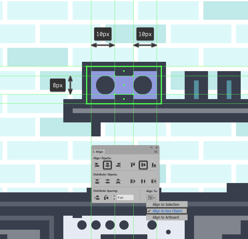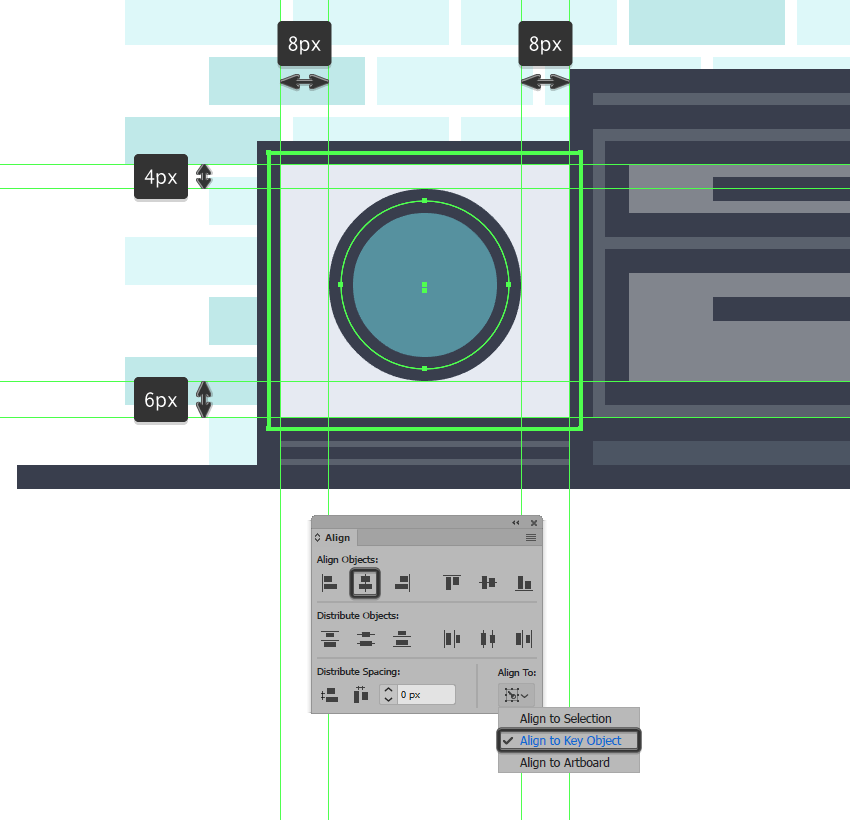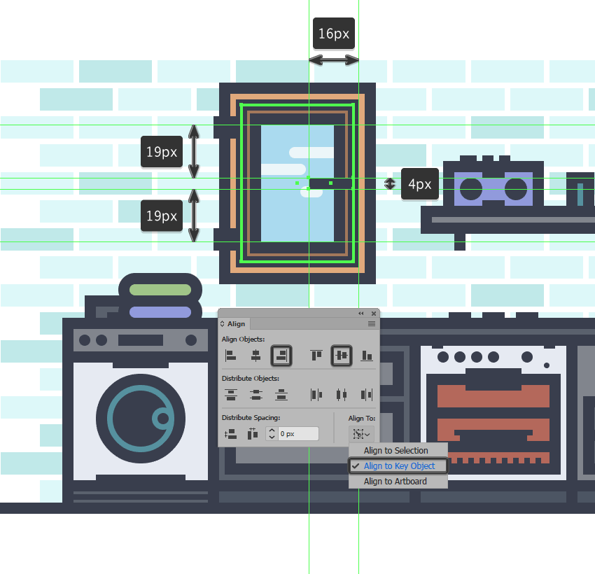 绘制三个8 x 4 px矩形(#363C4C),其水平间距4px.编组后,将其与烤箱中心对对齐。最后将整个厨房灶台编组后进入下一个部分。