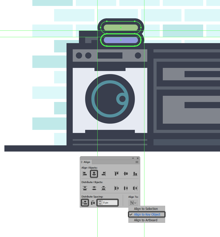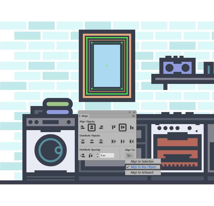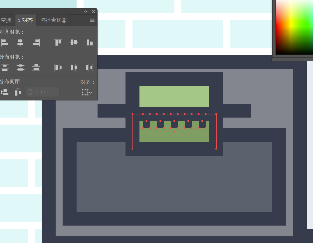 2.毛巾:在毛巾架的前面,绘制24x10pxx(#A1C689)的矩形,以及它的轮廓描边大小为4 x(#363C4C)。中心对齐之后进行编组(Control-G)。