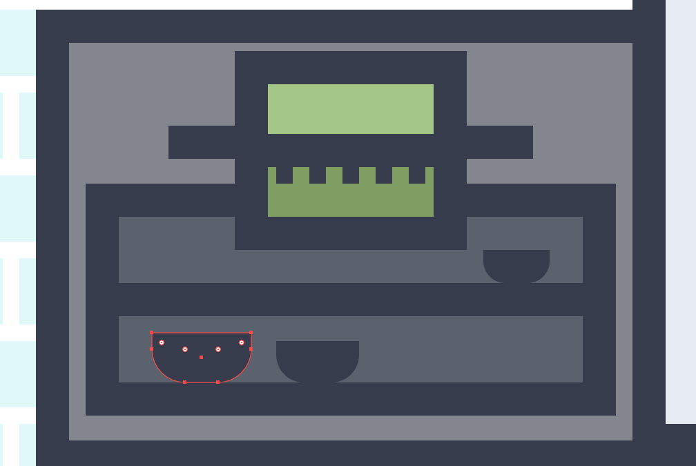 5.添加小碗:绘制三个矩形(12×6像素,10×6像素,10×4像素)颜色为#363C4C,然后将矩形的下面两个锚点调整为圆角半径4px,完成后将整个开放橱柜进行编组进入下一个部分的绘制。