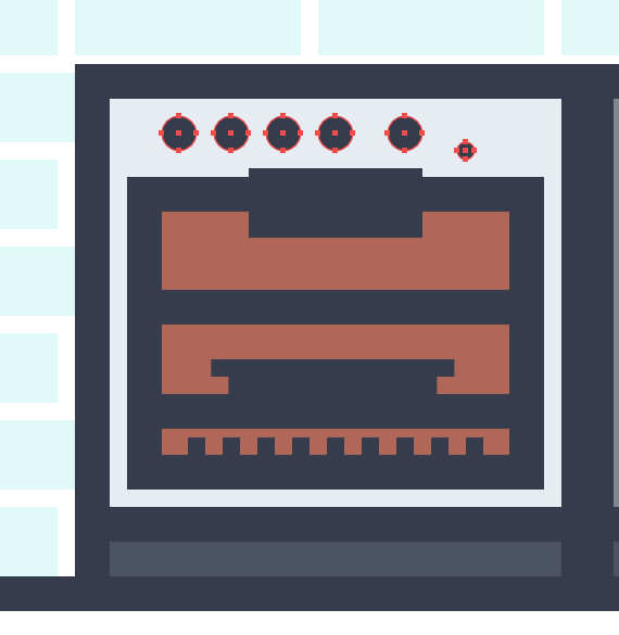 1.烤箱的刻度控制:绘制4个4 x 4 px的圆形(#363C4C),其间距为2px.编组后放置在距离火炉左边缘6px 上边缘2px处。、